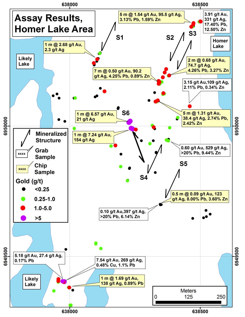 Twenty-five grab samples were taken from the immediate Homer Lake area, where six mineralized structures (five trending NE and one trending NW) were defined in the June exploration campaign, with chip sampling results that included 7 m @ 0.50 g/t Au, 90.2 g/t Ag, 4.25% Pb and 0.89% Zn. Recent samples contained up to 2.25 g/t Au, 159 g/t Ag, 11.25% Pb and 1.49% Zn (different samples). These samples variably expanded the known strike length of the main structures and indicated that several minor structures are also mineralized.